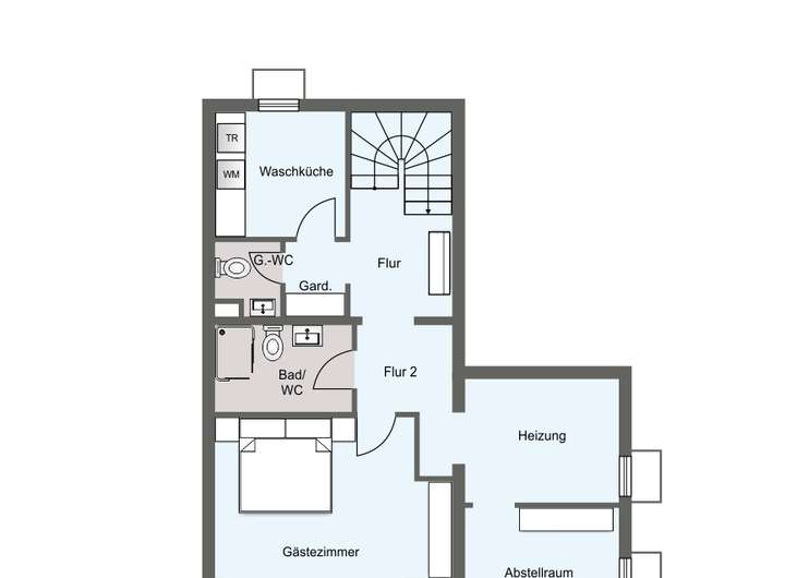 Ergänzend befinden sich hier noch die Waschküche, ein Abstellraum und der Heizungsraum mit der Gaszentralheizung.