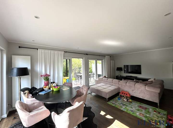 Neben dem luxuriösen Ambiente, dem offenen Grundriss und der der Möglichkeit einer separaten Einliegerwohnung genießen Sie Ihre Privatsphäre auf der schönen Terrasse mit großem Garten mit Südausrichtung.