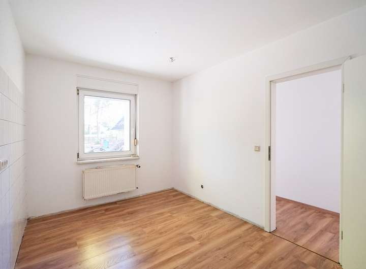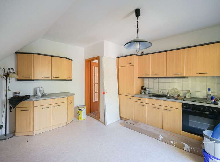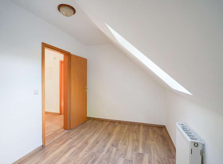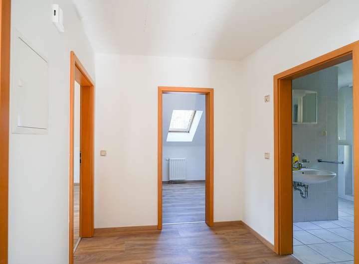 Die obere Wohneinheit spiegelt das Raumkonzept des Erdgeschosses in Teilen wider und überzeugt ebenfalls mit drei Zimmern, einer großzügigen separaten Küche und einem hellen Badezimmer mit Fenster. Auch hier ist eine klare Raumaufteilung gegeben, die sowohl Familien als auch Paaren oder Einzelpersonen eine angenehme Wohnatmosphäre bietet.