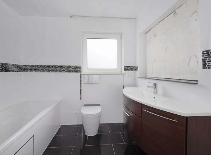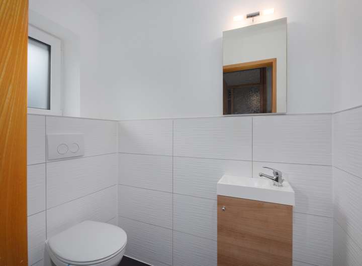 Das modern gestaltete Tageslichtbad ist mit Dusche und/oder Badewanne ausgestattet. Ein zusätzliches Gäste-WC bietet Komfort im Alltag.