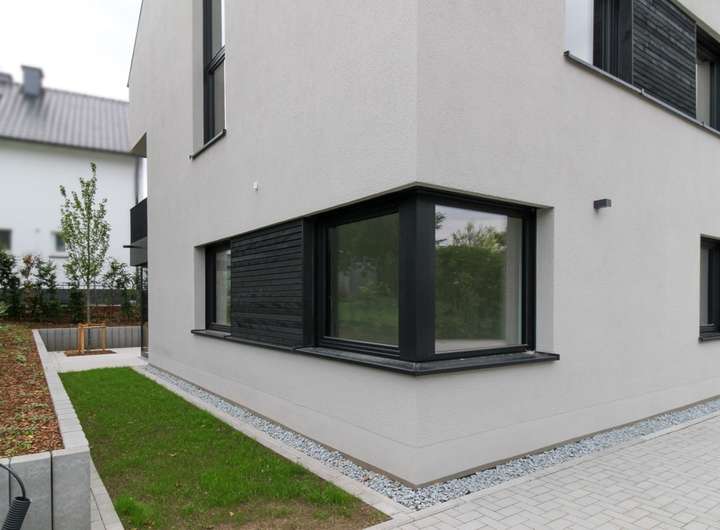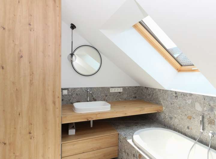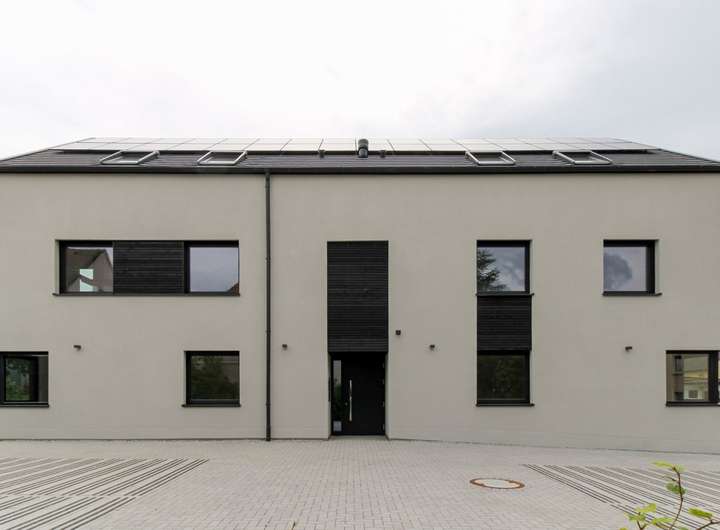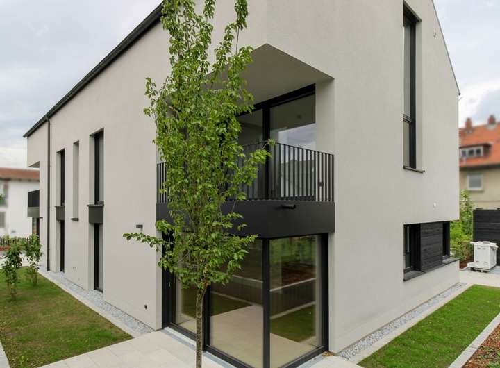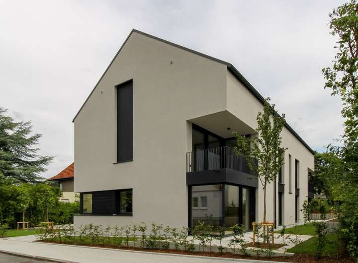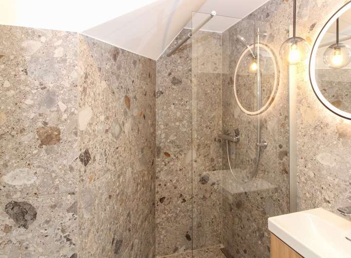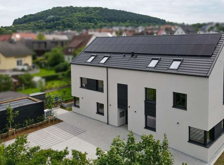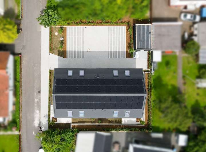 Das moderne Badezimmer in Steinfliesenoptik verfügt über eine bodentiefe Dusche, eine Badewanne und einen Waschmaschinenanschluss. Auf der unteren Ebene steht zusätzlich ein Gäste-WC zur Verfügung. Der Abstellraum bietet zusätzlichen Stauraum und der Außenstellplatz sowie die zwei E-Ladesäulen mit jeweils zwei Anschlüssen für das gesamte Objekt sind praktische Annehmlichkeiten. Der Fahrradschuppen und die PV-Anlage am Dach runden das Gesamtpaket dieser modernen Wohnung ab.