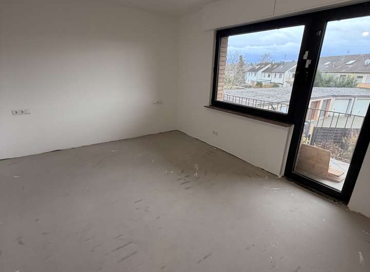 Über das Treppenhaus erreichen Sie das erste Obergeschoss. Rechts befindet sich ein großzügiges Zimmer mit Zugang zum Balkon, der ebenfalls über einen Einbauschrank verfügt – ideal als Schlafzimmer geeignet. Weiter entlang des Flurs liegen ein zusätzliches Zimmer, das sich hervorragend als Ankleide, Büro oder Kinderzimmer nutzen lässt, sowie das modern gestaltete Badezimmer mit offener Dusche.