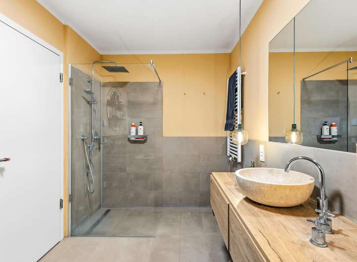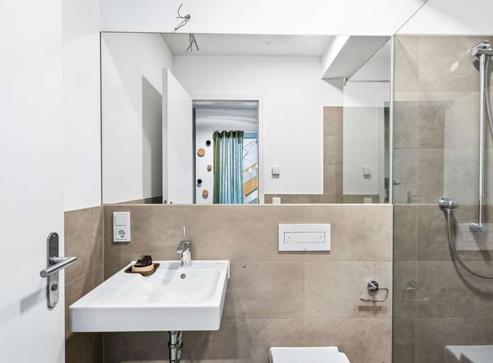 Die Wohnung ist bequem über den Aufzug erreichbar und verfügt über zwei Schlafzimmer, ein Gäste-WC mit Dusche sowie ein Hauptbadezimmer mit Badewanne und separater Dusche.