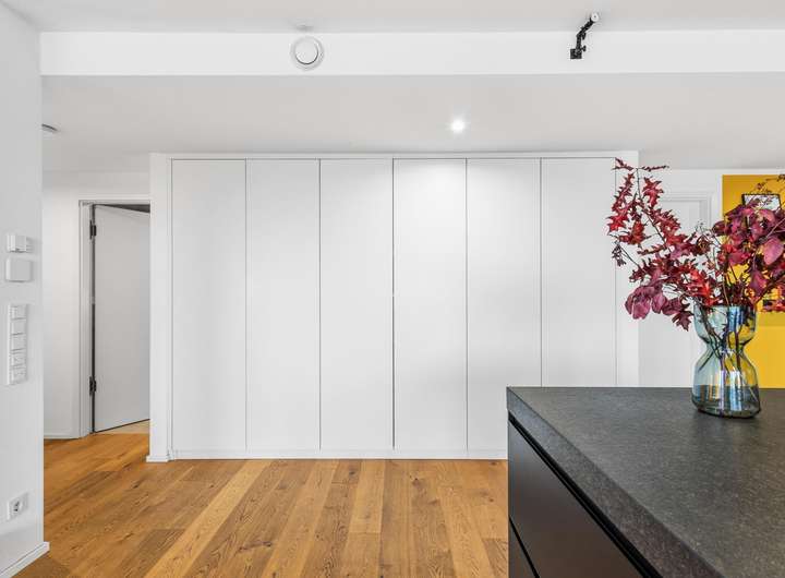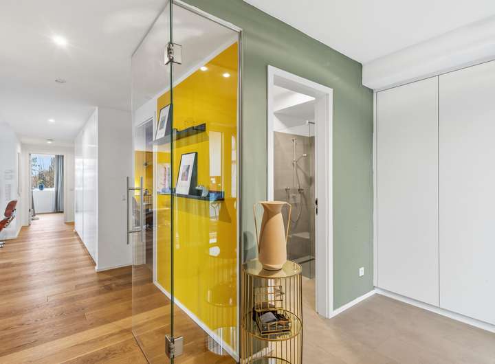 Ursprünglich wurde die Wohnung als 4-Zimmerwohnung geplant. Die Eigentümer entschieden sich jedoch dafür eine Wand zu entfernen und in eine 3-Zimmerwohnung zu ändern um den großen Wohn- und Essbereich maximal zu betonen. Eine Erweiterung zurück zur ursprünglichen 4-Zimmer-Konzeption ist jederzeit möglich, um so ein zusätzliches Kinder- oder Gästezimmer zu schaffen.