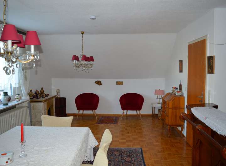 Großzügig und zugleich gemütlich wirkt im Erdgeschoss das Wohnzimmer. Ein stilvoller Blickfang ist der gemauerte Kamin. Das große Glaselement gibt den Blick in den Garten frei und ermöglicht den Zugang zur Terrasse. Das Wohnzimmer ist durch einen Rundbogen mit dem Esszimmer verbunden. Hier steht genügend Platz für einen großen Esstisch und Sideboards zur Verfügung. In beiden Räumen ist durchgängig ein schöner Parkettboden in einem warmen Holzfarbton verlegt. Direkt neben dem Esszimmer liegt die Küche. Im Schlaftrakt befindet sich das ca. 25 m² große Schlafzimmer, das Bad, das Gäste-WC und ein Kinderzimmer.