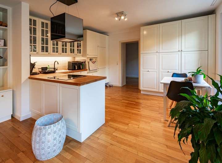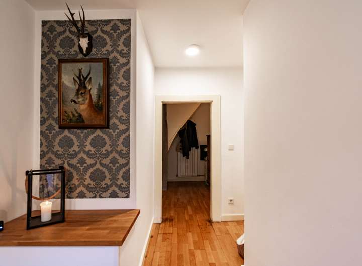 Die ca. 89m² Wohnfläche im Erdgeschoss wurden in den letzten Jahren umfassend saniert und präsentieren sich in einem äußerst gepflegten, bezugsfertigen Zustand. Helle Räume mit Eicheparkett, ansprechenden Feinheiten, wie eine freigelegte Wandfläche und geschmackvolle Materialien schaffen eine Atmosphäre mit Seele und Stil.