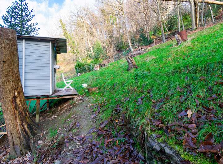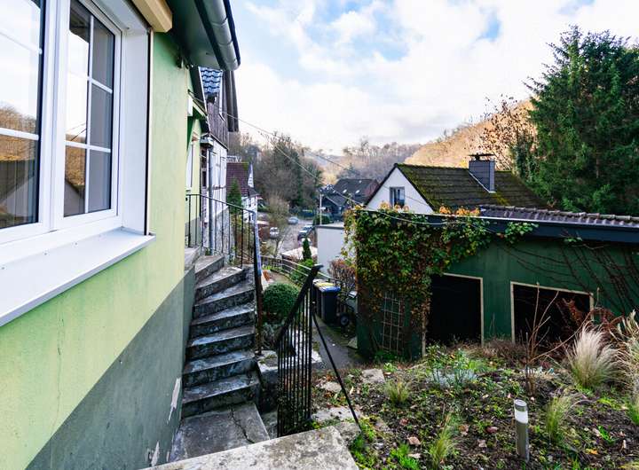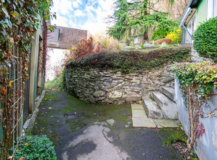 Die Lage in Hangposition verleiht dem Grundstück eine einzigartige Topografie mit bewaldetem Grundstücksanteil und hohem Maß an Privatsphäre. Das Haus ist nur fußläufig über einen steileren Aufgang erreichbar – ein Aspekt, der zur besonderen Atmosphäre dieses Ortes beiträgt. Ausreichend Stellplätze befinden sich im Umfeld.