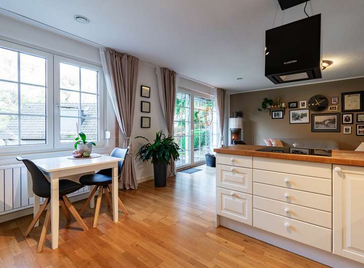Das Herzstück bildet der großzügige Wohnbereich mit Kaminofen – ein Ort für gemütliche Stunden zu jeder Jahreszeit. Von hier aus gelangen Sie direkt auf die sonnige Terrasse mit Blick auf den gegenüberliegenden Hang und das Tal – ein idyllischer Platz zum Durchatmen. Manuelle Jalousien und eine Markise sorgen für zusätzlichen Komfort.