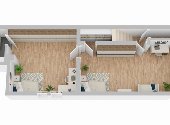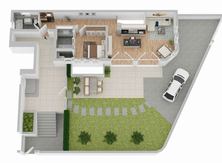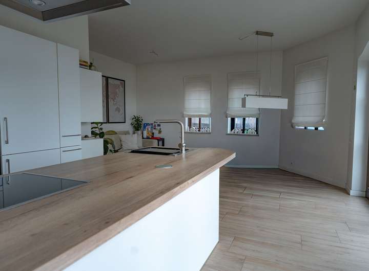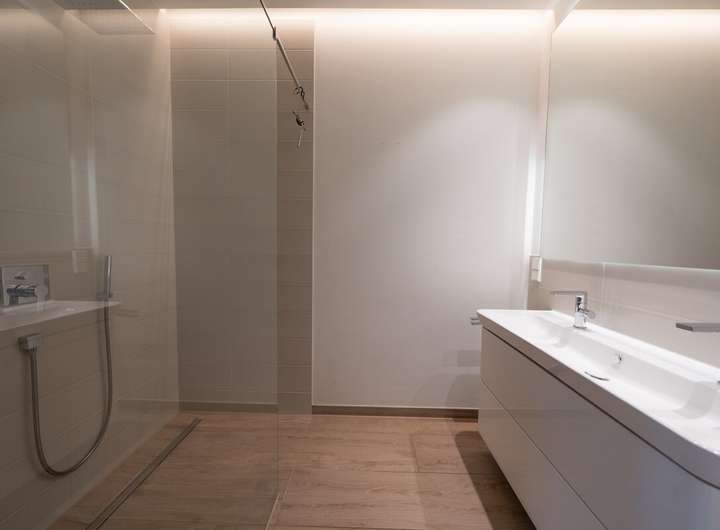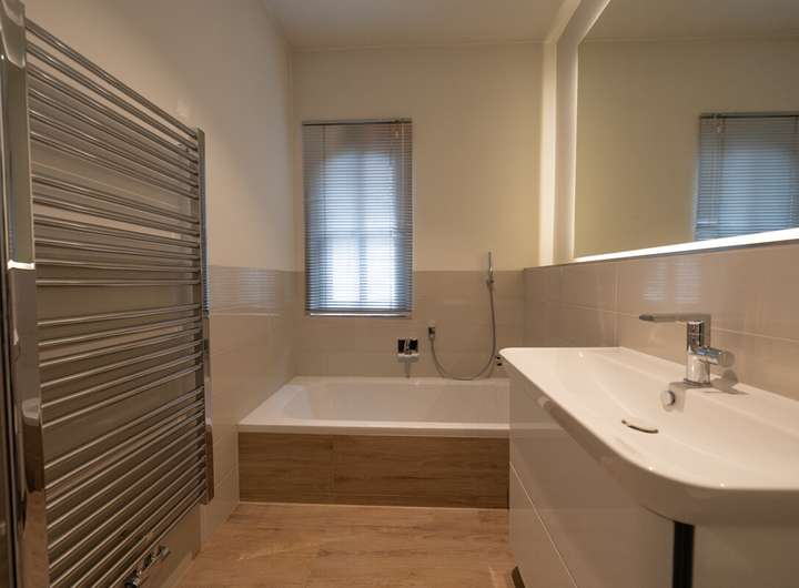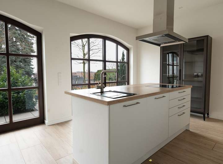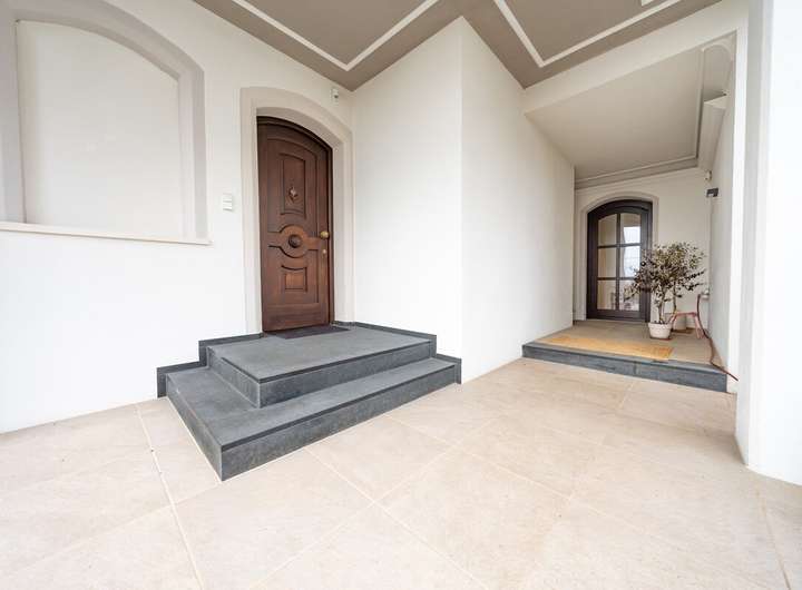 Über den eigenen Zugang durch den Eingangsbereich erreichen Sie die große eigene Haustüre. Die Wohnung erstreckt sich über das gesamte Erdgeschoss und ist mit hochwertigen Ausstattungsmerkmalen versehen, darunter Natursteinfliesen.