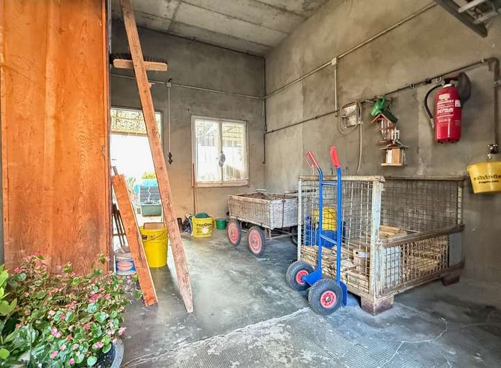 Im Erdgeschoss befinden sich ein Wohnzimmer mit Kachelofen, ein Schlafzimmer, eine Küche mit Holzofen sowie ein Tageslichtbad, das Mitte der 2000er Jahre erneuert wurde. Zusätzlich gibt es verschiedene Nutzräume, darunter Abstell- und Werkbereiche sowie zwei Garagen. Im Hof steht ein Stellplatz für ein Fahrzeug zur Verfügung. Hinter dem Haus liegt der Garten mit Freisitz, Geräteschuppen sowie Bereichen für Blumen- und Gemüsebeete.