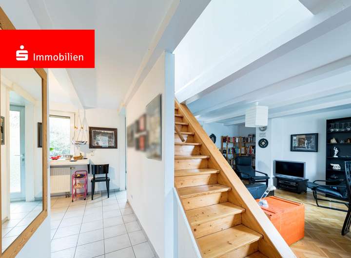 Beim Betreten des Hauses fällt sofort die wunderschöne Holztreppe ins Auge, sie ist im Erdgeschoss zugleich Raumtrenner zwischen dem behaglichen Wohnzimmer mit Eiche-Parkettboden und der offen gestalteten Küche mit Einbauküche. Von hier aus gelangen Sie auf die hausbreite Terrasse, die teilweise überdacht ist und sich zum Garten öffnet. Ein Tageslichtbad mit Badewanne befindet sich auch auf dieser Etage.
