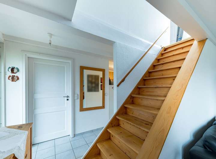 Gemütlich geht es weiter im Obergeschoss: Ein kleines Schlafzimmer mit Ankleide sowie ein von zwei Seiten belichtetes Zimmer zum Arbeiten oder Relaxen bilden diese Etage.