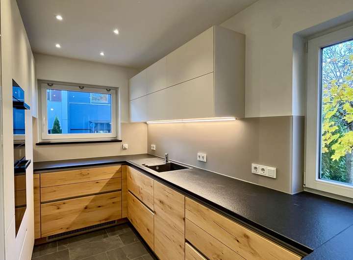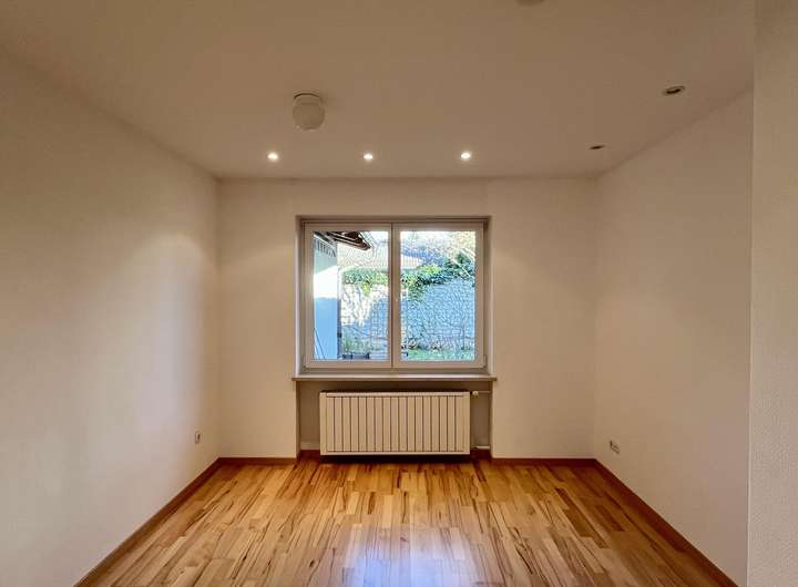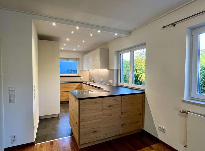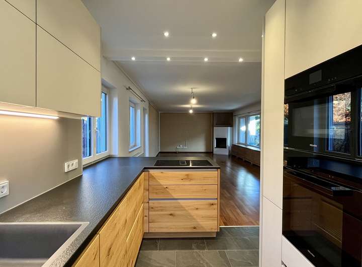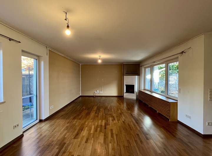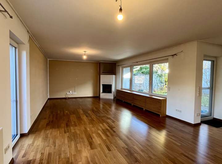 Beim Betreten des Hauses gelangen Sie zunächst in den einladenden Eingangsbereich, der den Zugang zu allen Wohnbereichen eröffnet. Geradeaus öffnet sich der großzügige Wohn- und Essbereich mit offener, hochwertiger Einbauküche aus dem Jahr 2020, die mit Markengeräten ausgestattet und im Mietpreis enthalten ist. Großzügige Fensterflächen sorgen für ein helles, freundliches Raumgefühl, während der stilvolle Kamin im Wohnzimmer an kühleren Tagen eine behagliche Atmosphäre schafft. Von hier aus führen Terrassentüren direkt in die beiden gepflegten Gartenbereiche mit Süd-Ost und Nordwest-Ausrichtung, ideal für sonnige Stunden zu jeder Tageszeit. Neben den beiden Terrassen befindet sich im Garten zusätzlich ein Freisitz für kältere Tage. Eine elegante Wendeltreppe verbindet den Wohnbereich mit dem Untergeschoss.