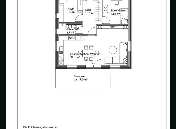 Im Erdgeschoss befinden sich der Technikraum, ein Flur mit Schranknische für die Garderobe, ein Gästebad mit Dusche, ein Schlaf- oder Arbeitszimmer, sowie ein offener Wohn- & Essbereich mit Ausgang zur Terrasse und dem kleinen Garten.