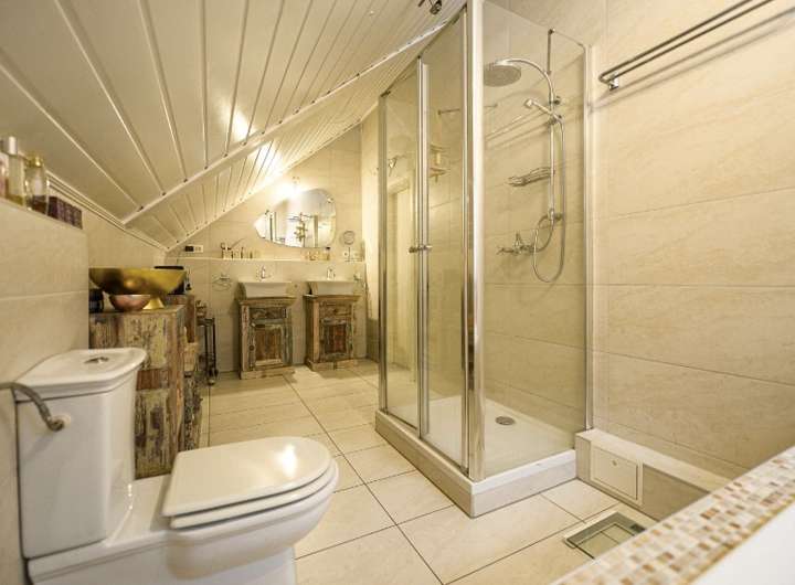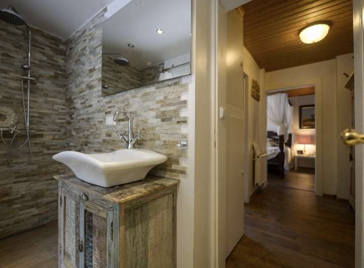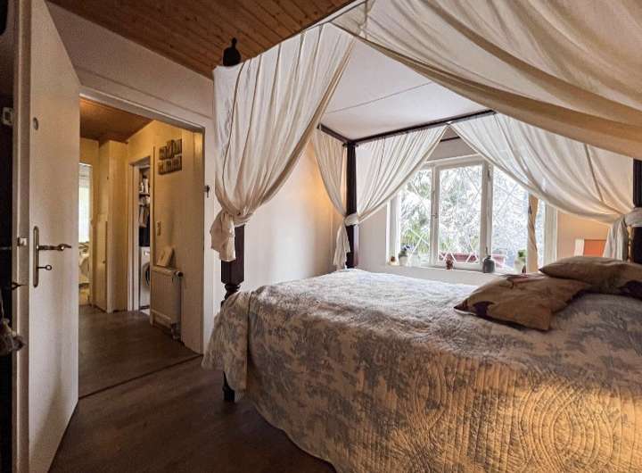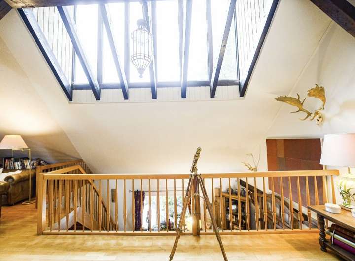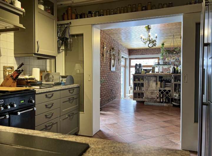 Die modernisierte Landhausküche bietet viel Stauraum, qualitative Einbauten und ein funktionales, ansprechendes Design. Galerie, Bibliothek und Studio schaffen flexible Nutzungsmöglichkeiten – ideal für Homeoffice, Atelier oder Gästezimmer. Fünf modernisierte Schlafzimmer bieten Platz für Familie oder Besucher, viele mit Blick auf das Naturgrundstück. Ein Vollbad, ein Duschbad und ein Gäste-WC ergänzen die Ausstattung mit zeitlosen Materialien und modernen Armaturen.