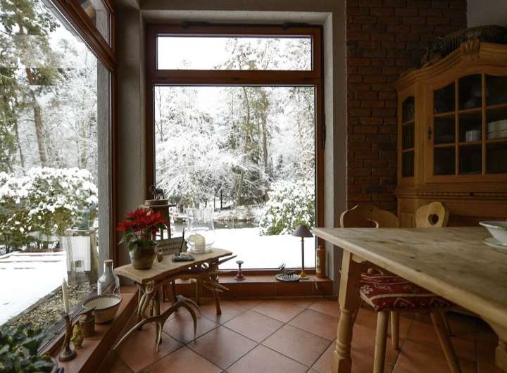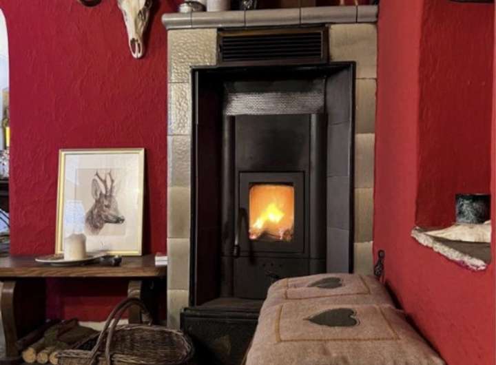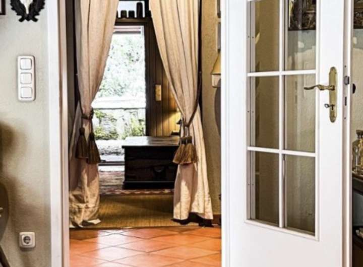 Die Innenräume sind hochwertig modernisiert und bieten warme Farbtöne, natürliche Materialien und eine großzügige Raumwirkung. Der zentrale Wohnbereich überzeugt mit großen Fensterfronten, Blick ins Grüne, Fußbodenheizung, Kaminöfen und hochwertigen Bodenbelägen. Die offene Gestaltung verbindet Wohnen, Essen und Entspannen harmonisch.