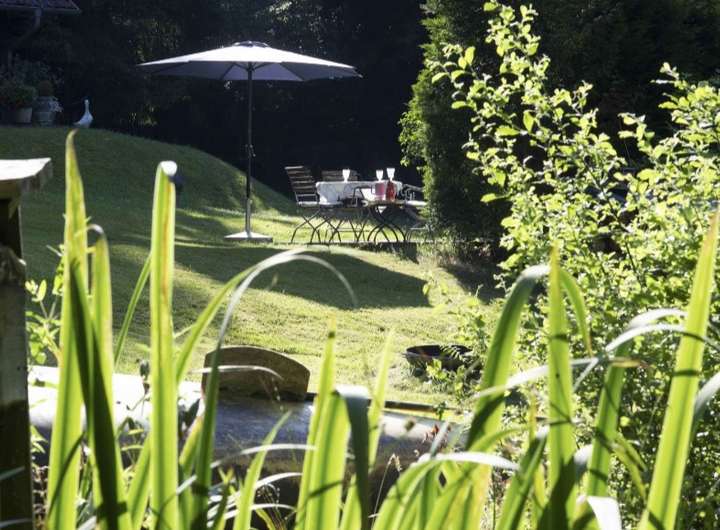 Das große Naturgrundstück bietet Rasenflächen, Baumbestand, Natursteinstrukturen und mehrere idyllische Teiche. Ein Steg, Terrassen und Sitzbereiche schaffen Rückzugsorte und laden ganzjährig zur Erholung ein.