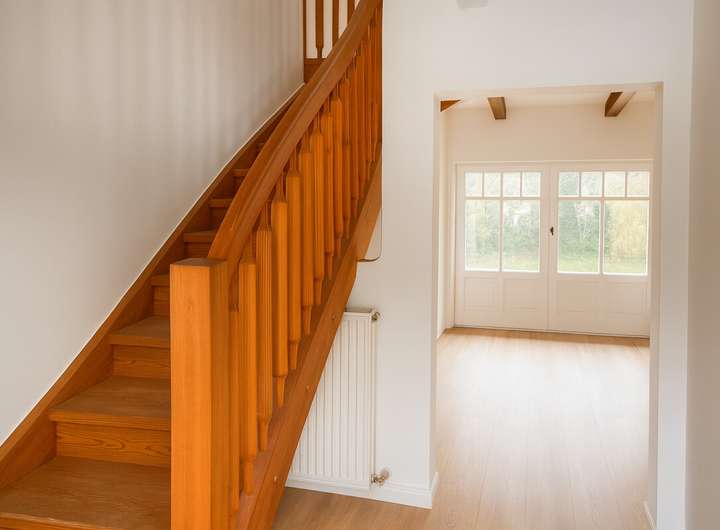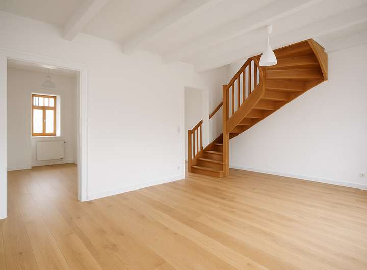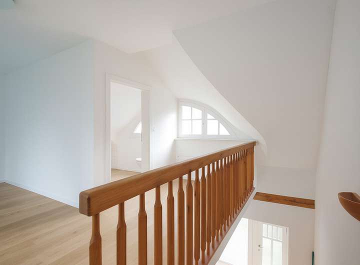 Sie betreten die Wohnung über einen eigenen Eingang und werden von einer massiven Holztreppe