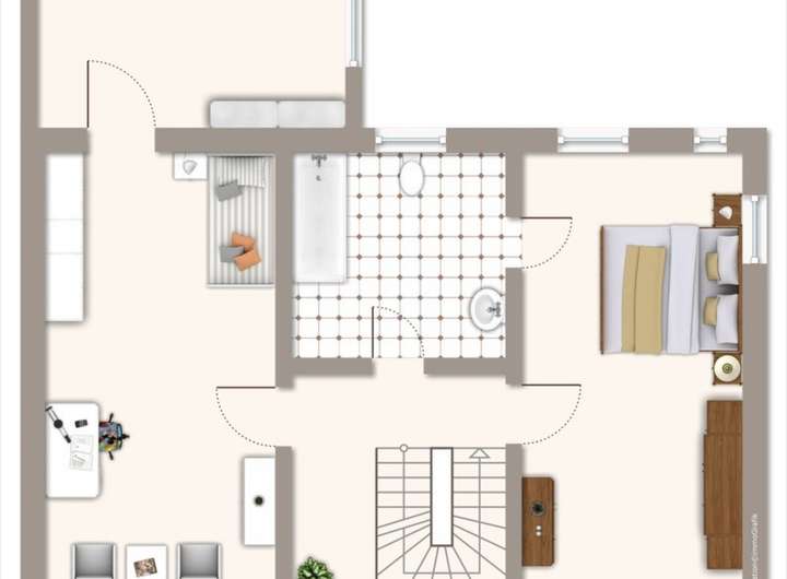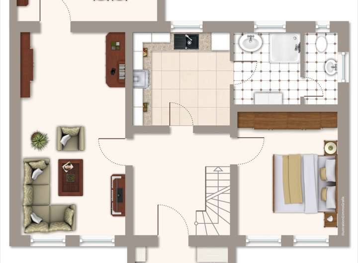 Das Haus besticht durch eine funktionale Raumaufteilung mit vier Zimmern, darunter zwei Kinderzimmer – perfekt für Familien oder alle, die sich großzügige Wohn- und Arbeitsbereiche wünschen. Die angenehme Höhe der Holzbalkendecken verleihen den Räumen eine luftige Großzügigkeit und einen besonderen Charakter, den man sofort spürt.