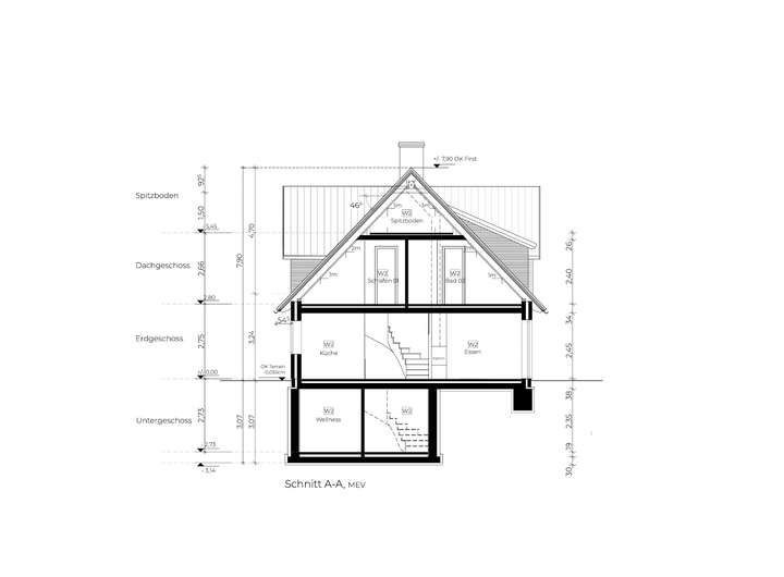 Das Erdgeschoss empfängt Sie mit einem Vorflur, ausgestattet mit Garderobenschrank, Naturstein-Gäste-WC und Tischlerholztüren. Von hier aus gelangen Sie in den lichtdurchfluteten Wohn- und Essbereich mit Eichedielen. Die maßgefertigte Tischlerküche mit hochwertigen Geräten verfügt über ein Ceranfeld mit Muldenlüfter und eine Arbeitsplatte aus Nero Assoluto Naturstein. Ein moderner Gaskamin sorgt für Wohlfühlatmosphäre. Von hier aus führen Treppen sowohl ins Untergeschoss als auch ins Dachgeschoss. Südseitig öffnet sich der Wohnbereich zur Bangkirai-Terrasse.