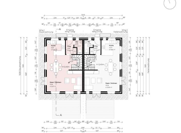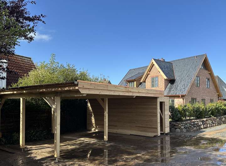 Die Wohnzimmer verfügen jeweils über zwei Terrassentüren, wobei die südlich ausgerichtete direkt auf die Bangkirai-Terrasse führt. Alle Holzfenster des Hauses öffnen sich nach außen. Zu jedem Hausteil gehört ein Stellplatz im Carport sowie ein dort befindlicher Abstellraum. Für die Dauerwohnung steht zusätzlich ein weiterer Abstellraum direkt am Haus zur Verfügung.