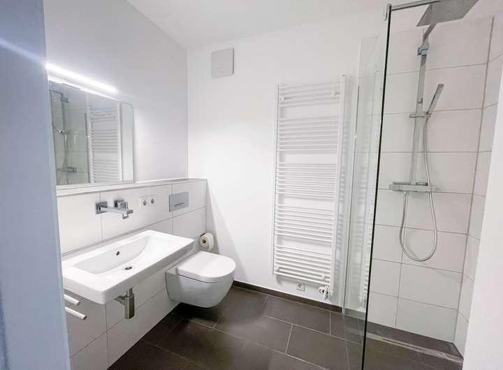 - Pflegeleichtes, zeitloses Badezimmer + Gäste-WC mit Dusche