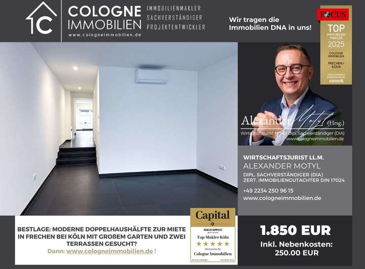 Angeboten wird eine exklusive, frisch sanierte Doppelhaushälfte zur Miete in begehrter Lage von Frechen CITY - einer der beliebtesten Städte im direkten Kölner Umkreis in NRW. Bereits von außen überzeugt die Immobilie durch ihre neuwertige Erscheinung. Hier vereinen sich Wohnqualität, Komfort und ein angenehmes, familienfreundliches Umfeld.