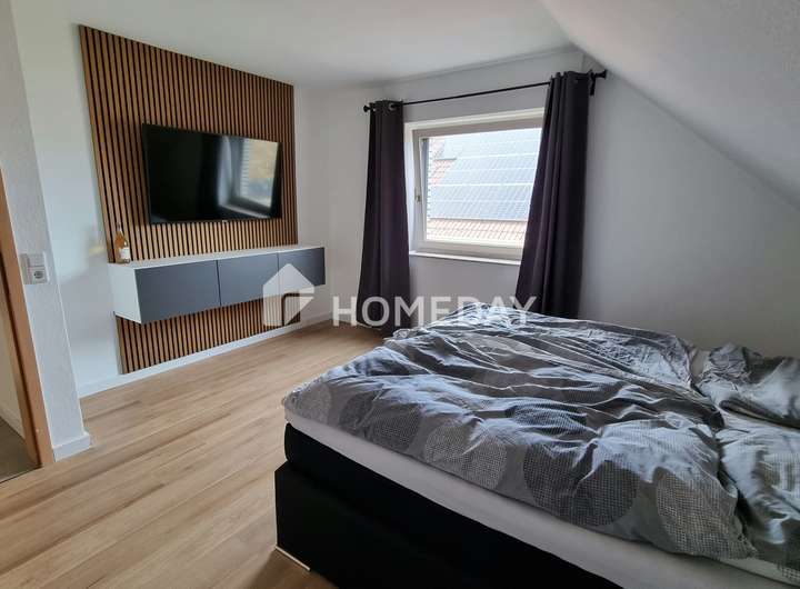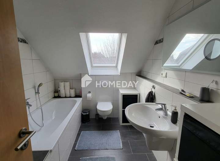 Die renovierte Dachgeschoss-Einheit mit neuen Bodenbelägen, modernem Bad und erneuerten Dachflächenfenstern bietet unter gemütlichen Dachschrägen eine wohnliche Atmosphäre. Sie wurde 2024 neu vermietet (Kaltmiete 640,00 Euro), mit deren Einnahmen zum Beispiel die direkt anfallenden Kosten gedeckt werden können. Eine Eigennutzung für Familienmitglieder oder eine Erweiterung des bestehenden Wohnraums ist denkbar.