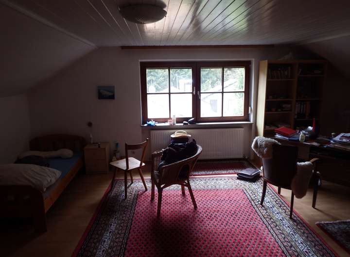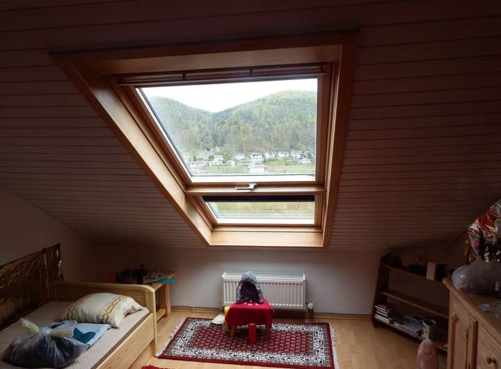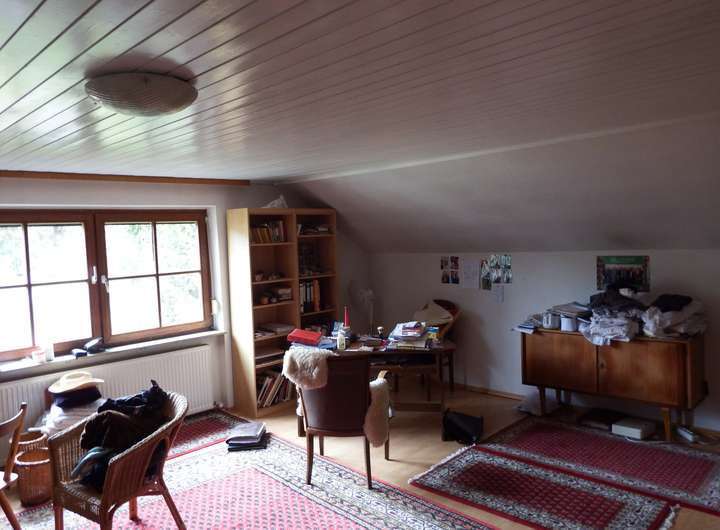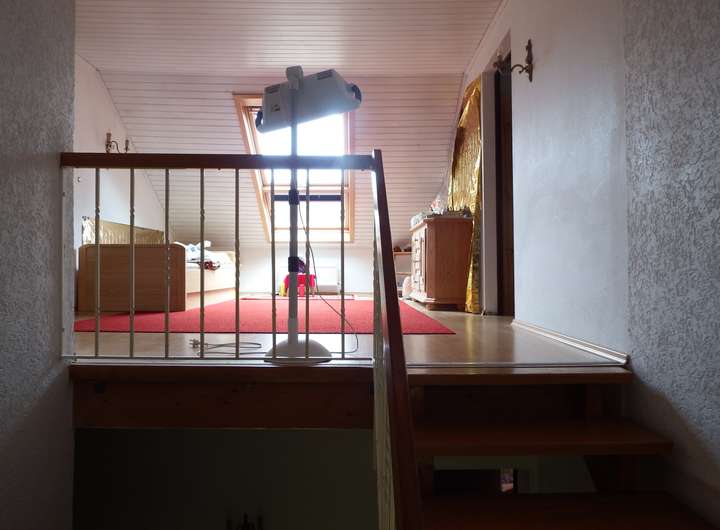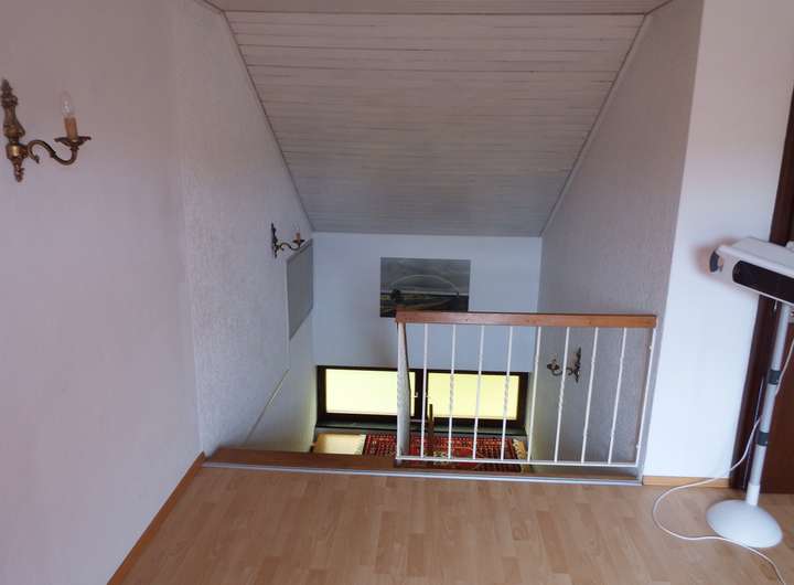 Über die bereits erwähnte Holztreppe erreichen Sie das helle Dachgeschoss. Hier empfängt Sie ein großzügiger Vorraum mit Zugang zu zwei weiteren Zimmern sowie einem zusätzlichen Badezimmer mit Toilette.