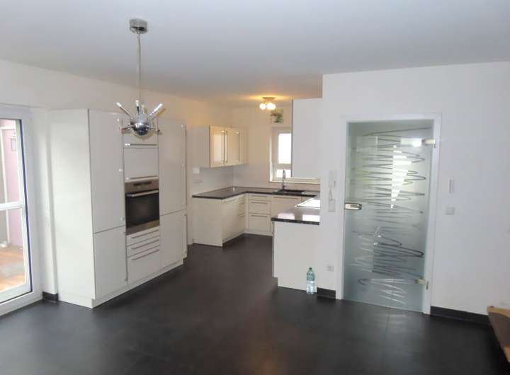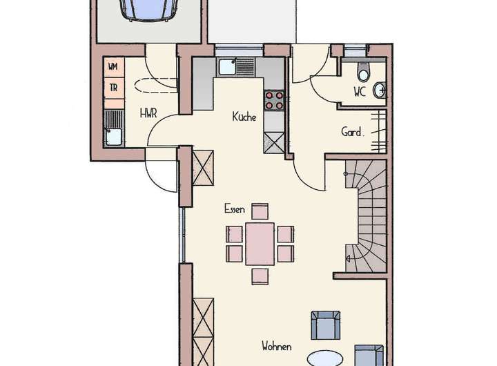 Im Erdgeschoss befinden sich Diele mit Garderobe, der großzügige Wohn- Essbereich mit halboffener Küche, das Gäste-WC und der Hauswirtschaftsraum mit Zugang zu Garage, Pergola und Garten.
