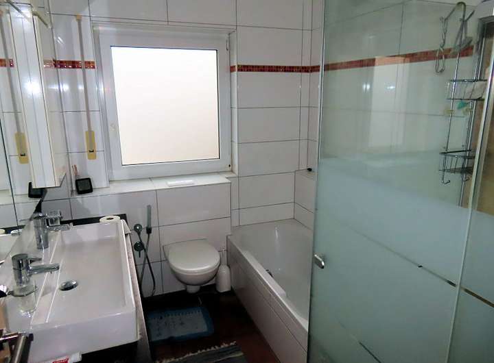 Sanitäreinbauten Bad: Badewanne, Dusche mit Echtglaskabine, Waschtisch mit Unterschrank, WC