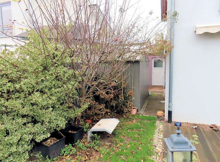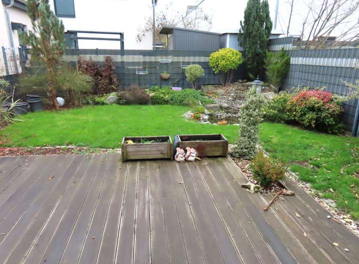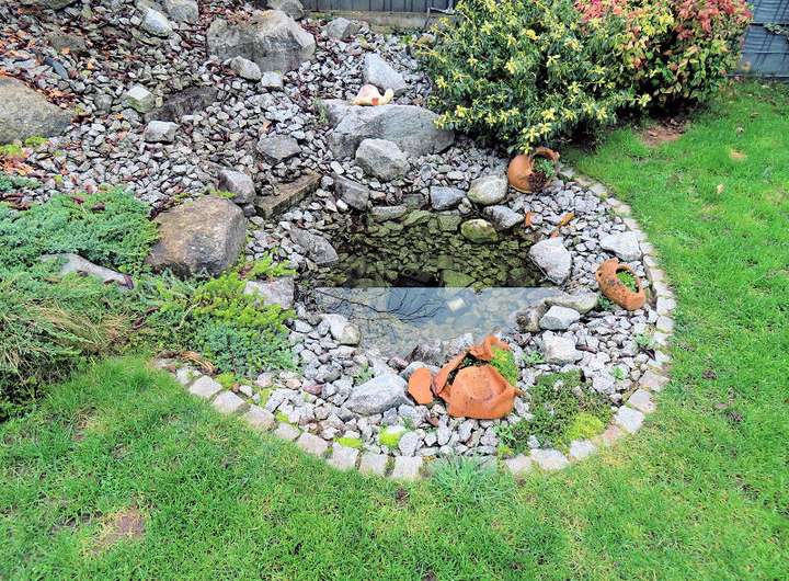 Der Garten ist pflegeleicht mit Rasenfläche, Ziersträuchern und einem kleinen Teich angelegt.
