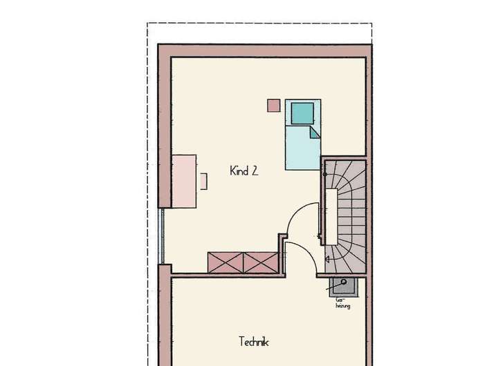 Das Dachgeschoss bietet ein weiteres Zimmer und den Technikraum in dem die Heizanlage installiert ist.