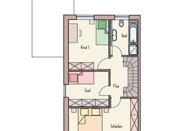Im Obergeschoss sind ein Kinderzimmer, das Schlafzimmer, ein Gästezimmer (oder weiteres Kinderzimmer) und das Bad untergebracht.