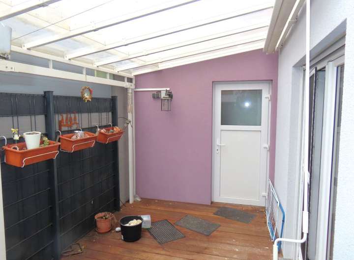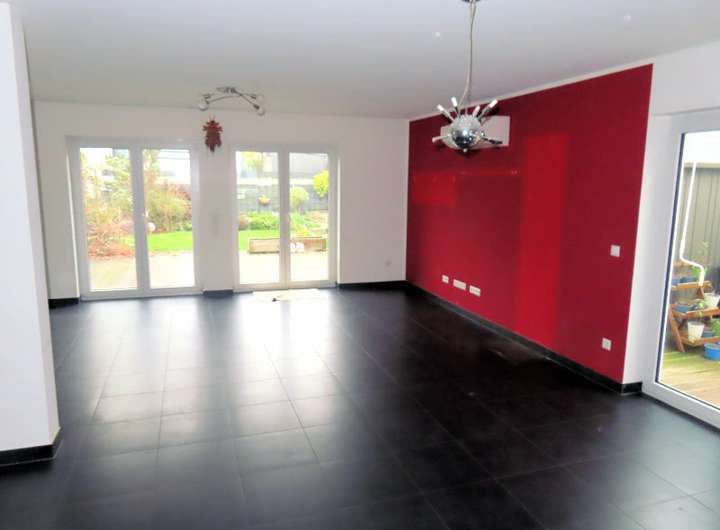 Der Essbereich hat Zugang zur Pergola, der Wohnbereich zur Terrasse.