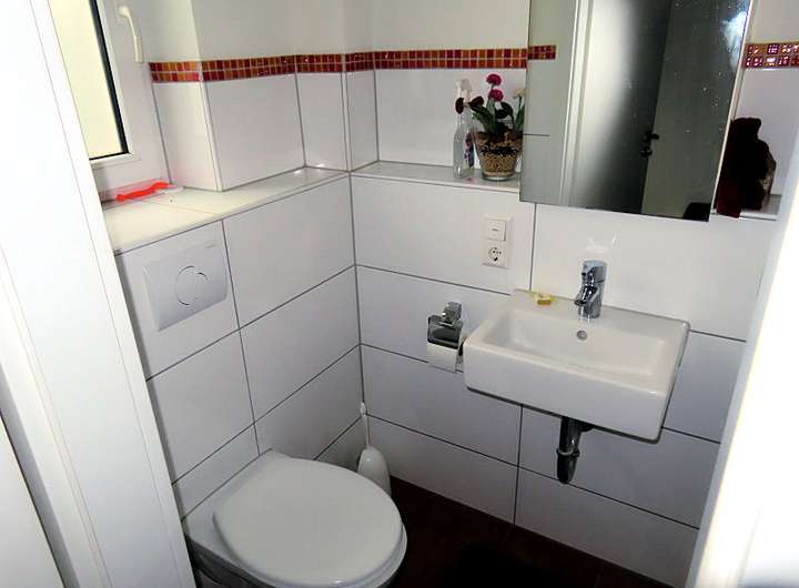 Gäste WC: Handwaschbecken, WC, Spiegel