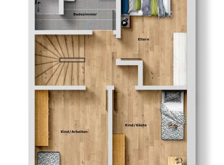 Im Obergeschoss liegen drei gut geschnittene Schlafzimmer, die Ihnen und Ihrer Familie ausreichend Rückzugsorte, oder auch Platz für ein Arbeitszimmer bieten.