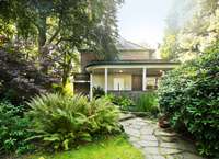 Das Grundstück befindet sich weit von der Straße zurückgesetzt inmitten dicht bewachsener Gärten.