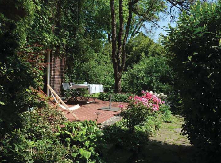 Der Garten verfügt über alten Baumbestand und große Rhododendrengruppen.
