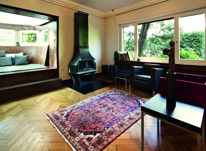 • Wandvertäfelungen, Wandschränke und Heizkörperverkleidungen aus dunklem Holz.