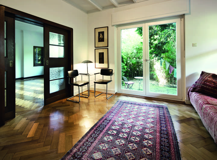 • Doppel-Schiebetüren mit alten Glasfüllungen (Eisblumenglas).