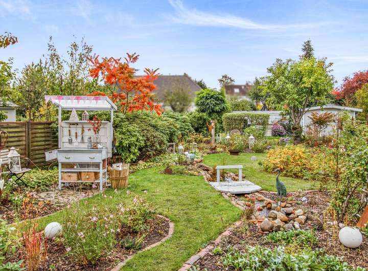 - Liebevoll angelegter Garten mit kleinem, dekorativem Bachlauf und elektrischer Wasserpumpe