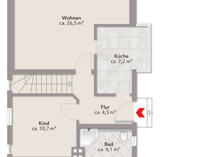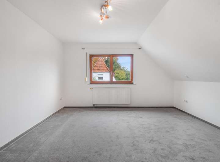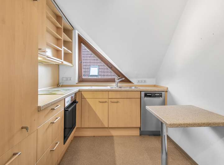 Die obere Wohneinheit verfügt über zwei Zimmer, ein Badezimmer, ein separates Gäste-WC sowie eine Küche. Vom Wohnzimmer aus führt der Zugang auf den Westbalkon, der einen angenehmen Blick ins Grüne bietet – ein idealer Ort zum Entspannen.