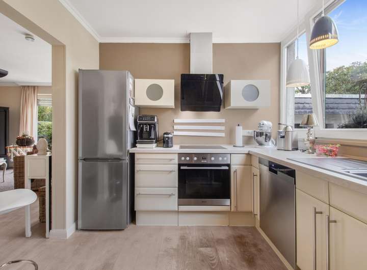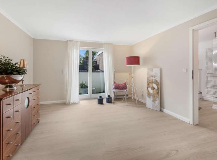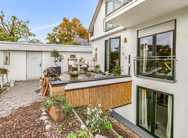 Die untere Wohneinheit wurde im Jahr 2024 vollständig modernisiert und überzeugt durch ihren hochwertigen, geschmackvollen Stil. Vier helle Zimmer, eine moderne Einbauküche mit Markengeräten, zwei gepflegte Badezimmer sowie edle Farbtöne von Farrow & Ball verleihen dieser Einheit ein besonderes Wohnambiente. Vom großzügigen Wohn- und Essbereich gelangt man direkt auf die sonnige Westterrasse mit schönem Blick in den Garten. Vom Souterrain hat am Zugang auf eine weitere Terrasse.