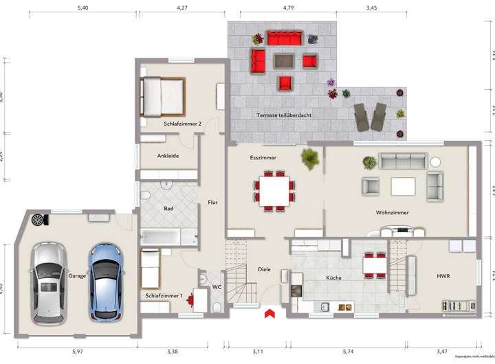 EG: Wohnzimmer, Esszimmer, Küche, Bad, Gäste-WC, 2 Schlafzimmer, Ankleide, HWR, Flur; überdachte Terrasse