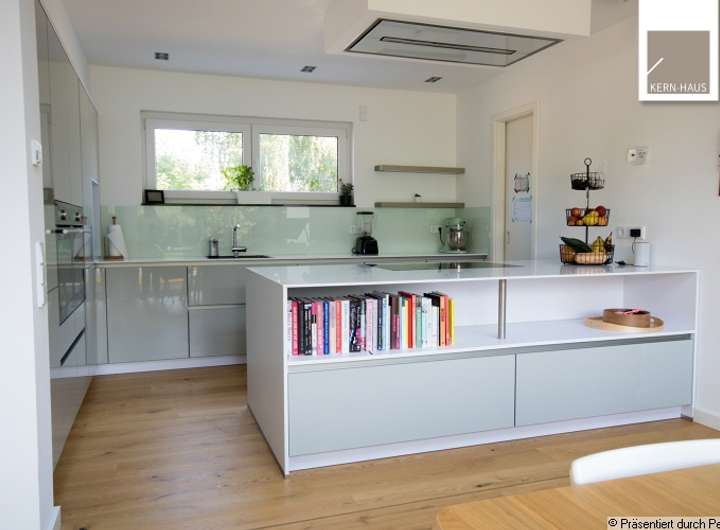Das große Wohn-/ Esszimmer mit äußerst praktisch und intelligent angeschlossener Küche mit Speisekammer bietet sich ideal für ausgiebige Abendessen oder zum gemütlichen Fernsehen an. Somit dient das Erdgeschoss des modernen Einfamilienhauses als Mittelpunkt für das gemeinsame Leben im Haus. Die beiden Erker des Hauses runden das Gesamtbild der Räume ab und schenken dem Wohn- und Esszimmer eine besondere Kontur und Tiefe.