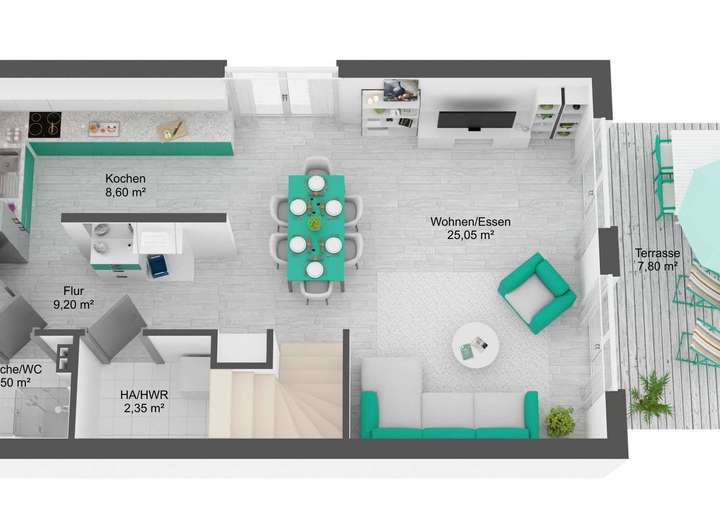 Im Erdgeschoss erwartet Sie ein offener Wohn- und Essbereich mit Zugang zur Terrasse und Garten, eine offene Küche mit Einbauküche, ein Gäste-WC mit Dusche und ein Hauswirtschaftsraum. Das erste Obergeschoss bietet zwei flexibel nutzbare Zimmer, ein großzügiges Schlafzimmer und ein stilvolles Tageslichtbad. Das Dachgeschoss überzeugt mit einem lichtdurchfluteten Studio, ideal als Arbeits- oder Gästezimmer.