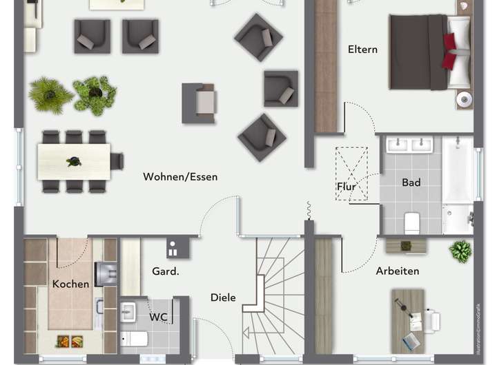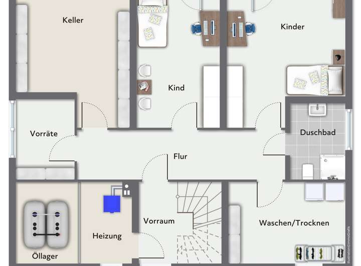 Den Zugang zum Untergeschoss finden Sie im bereits beschriebenen Dielenbereich. Das Untergeschoss verfügt über einen Heizungsraum inkl. Öllager, zwei Abstellräume, ein Duschbad sowie drei zu wohnzwecken geeigneten Räumen. Aufgrund der leichten Hanglage und der in diesem Bereich vorhandenen Südausrichtung wirken die Zimmer hell und freundlich. Alle drei Zimmer verfügen über einen Austritt auf die sonnenverwöhnte Terrasse/ Garten und sind der Wohnfläche zugeordnet.