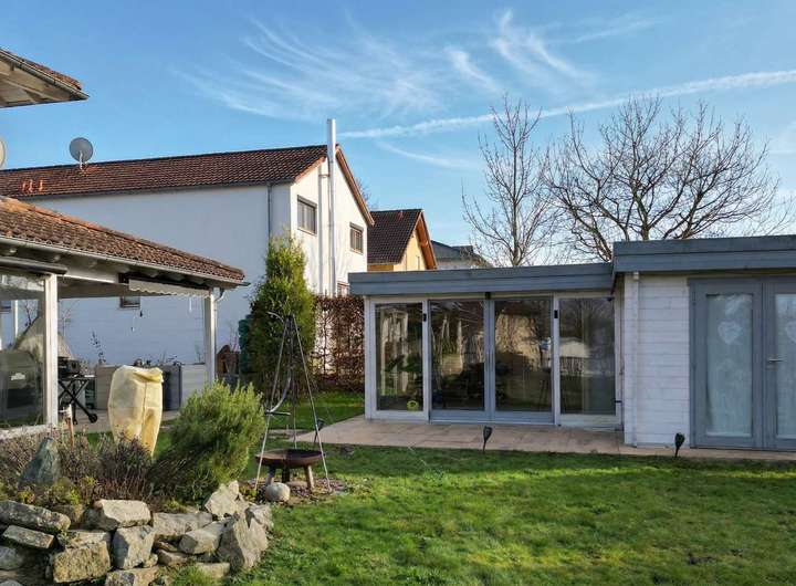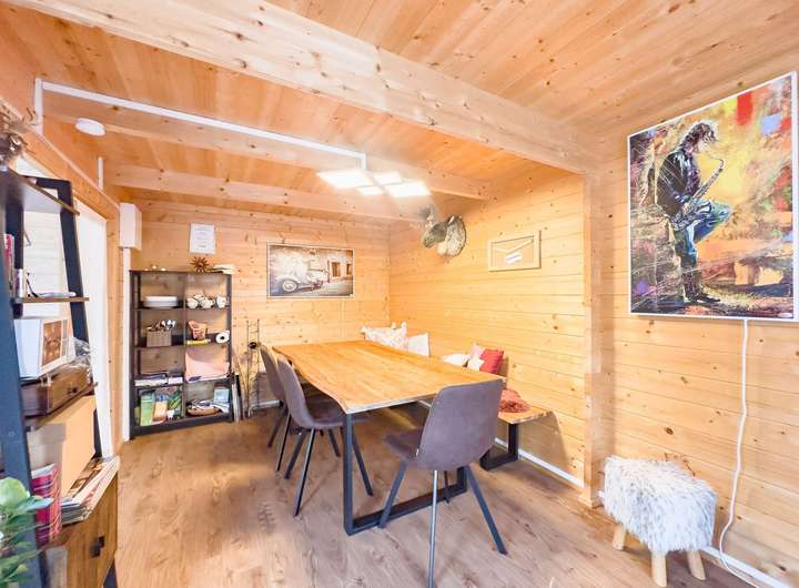 Draußen geht das Gefühl von Freiraum weiter. Das Grundstück ist groß genug für Gemüsebeete, Trampolin, Poolideen und entspannte Sommerabende. Das Gartenhaus bietet gleich zwei Räume, einer davon als gemütlicher Partyraum, ausgestattet mit Infrarotheizungen, Eckbank und Kühlschrank. Perfekt für Geburtstage oder einfach gute Nachbarschaft. Zusätzlich dazu gibt es eine Werkstatt in der Garage mit Starkstrom, viel Platz fürs Handwerken, Basteln oder kleine Projekte. Der Carport schützt zwei Autos und kann auf Wunsch sogar zu einer Garage geschlossen werden, weitere Stellplätze sind problemlos vorhanden.