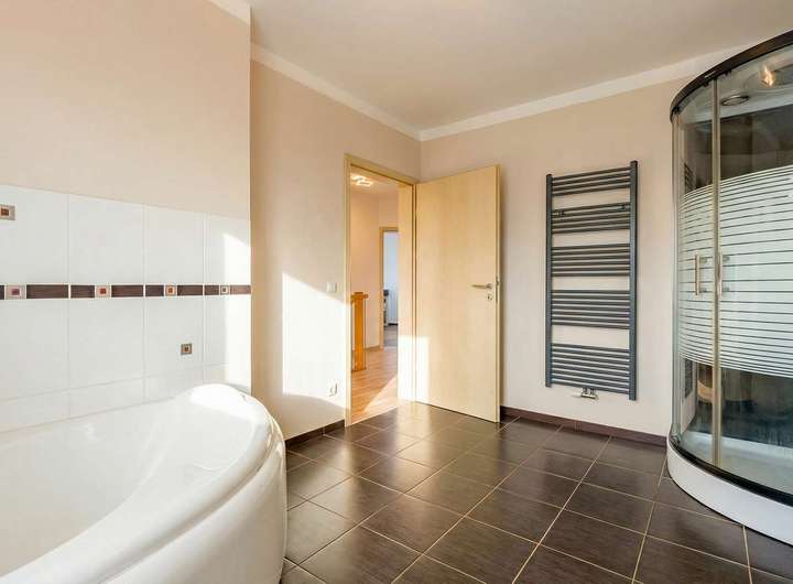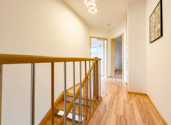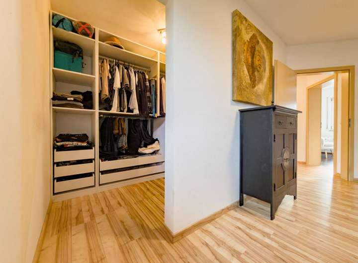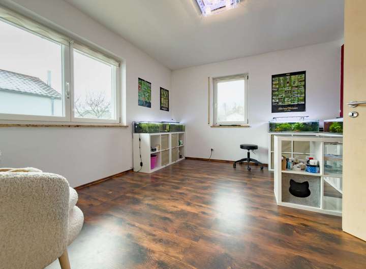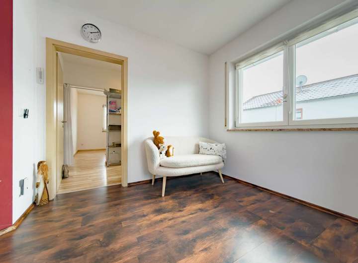Das Obergeschoss bringt Ruhe ins Haus. Das Elternschlafzimmer ist großzügig geschnitten und mit einem eigenen Ankleidezimmer verbunden – praktisch, klar strukturiert und angenehm privat. Das Bad daneben ist fast schon ein kleiner Wellnessbereich mit seiner großen Dusche, Beleuchtungselementen und der Eckbadewanne, die an langen Tagen den perfekten Ausgleich bietet. Die zusätzlichen Räume wurden bisher als Jugendbereich genutzt und lassen sich flexibel gestalten – ob Kinderzimmer, Spielzimmer, Büro oder Kombination daraus. Alles ist möglich, und genau das macht dieses Haus so familienfreundlich.